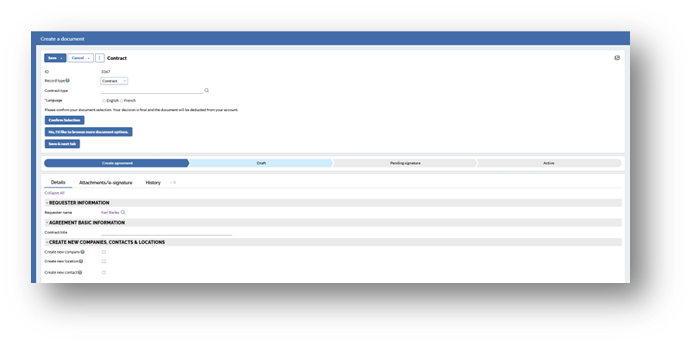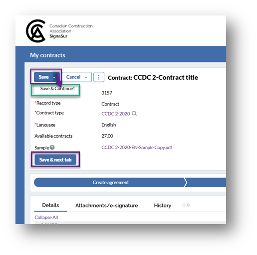 *Save and next tab – Preview: After clicking “Save and next tab”, the contract will switch from the “Details” tab to the “Attachments/E-signature” tab.