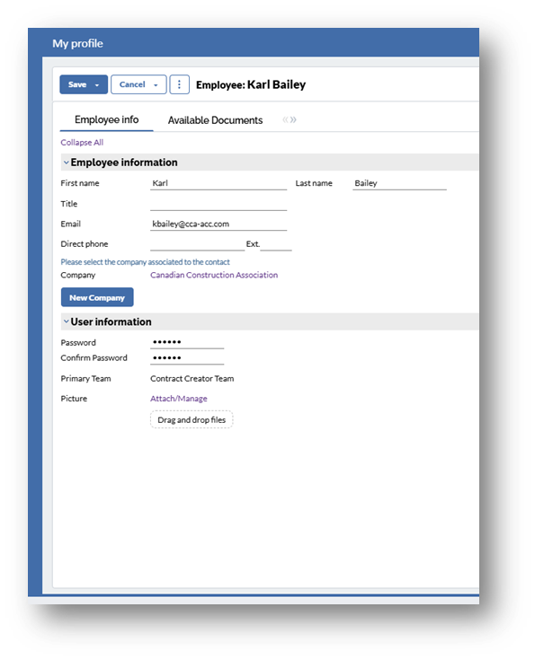- My profile: Input the employee information and user information.