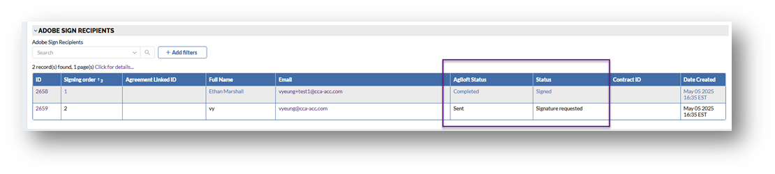 16. Once “Create Adobe agreement” is clicked, the contract package will be shown in the record, and the list of recipients will be auto-populated under Adobe Sign recipients.